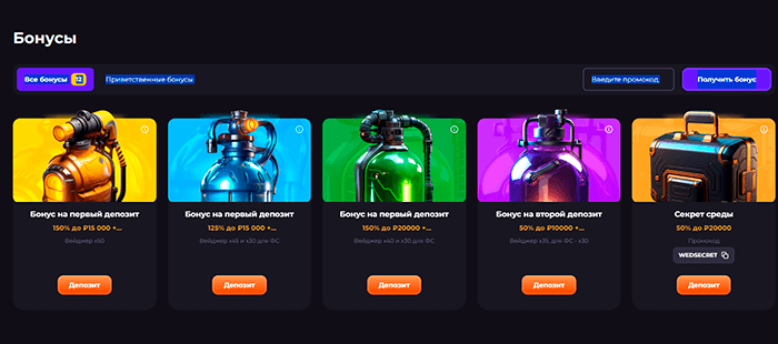 - приветственный пакет – 150-300% бонус и до 325 фриспинов за депозит от 500 RUB (в денежном эквиваленте сумма презента может достигать 45 000 руб., вейджер отыгрыша – х30);